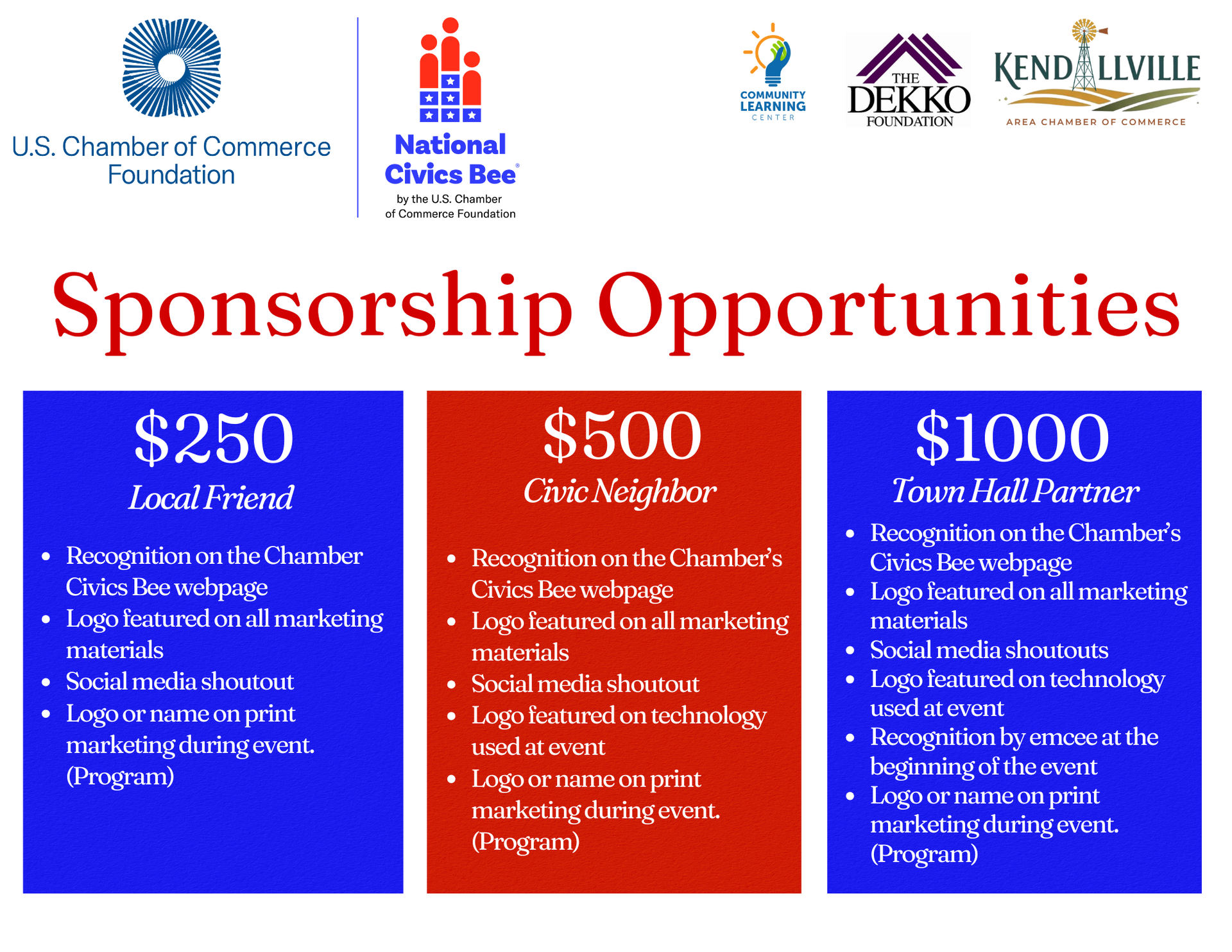 Are you interested in showcasing your company's commitment to developing active and engaged citizens? For information about available corporate sponsorships, please contact Nikole Albright, Executive Director, Kendallville Area Chamber of Commerce at (260)-347-1554 or nalbright@kendallvillechamber.com or complete our sponsorship form at: https://bit.ly/SponsorCivicBee